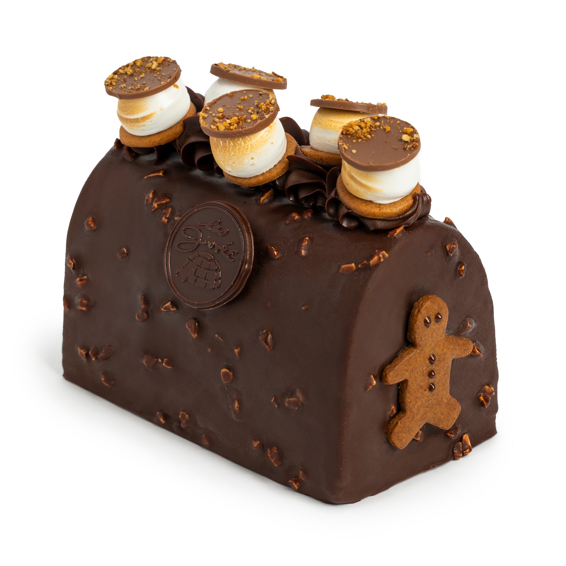 Bûche: Crème glacée caramel-amandes et chocolat, fourrée de guimauves grillées maison, génoise et sauce chocolat, miroir chocolat et mini S'more. 8-10 portions