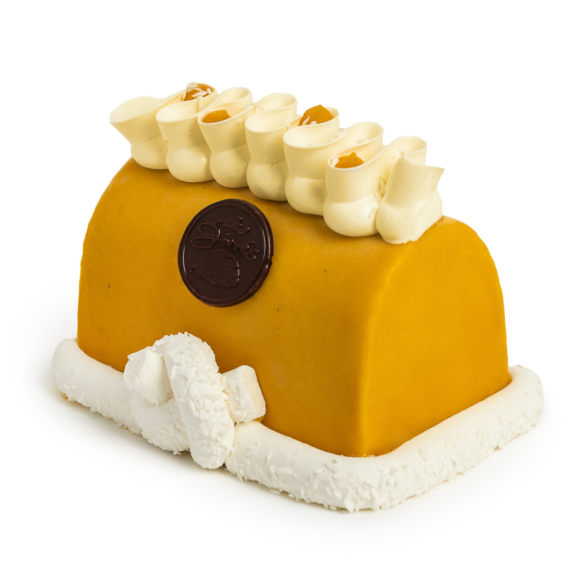 Bûche: Sorbet noix de coco et mangue/passion, compoté d’ananas caramélisé, génoise sans gluten et noix de coco, gelée de passion et guimauve maison. 8-10 portions