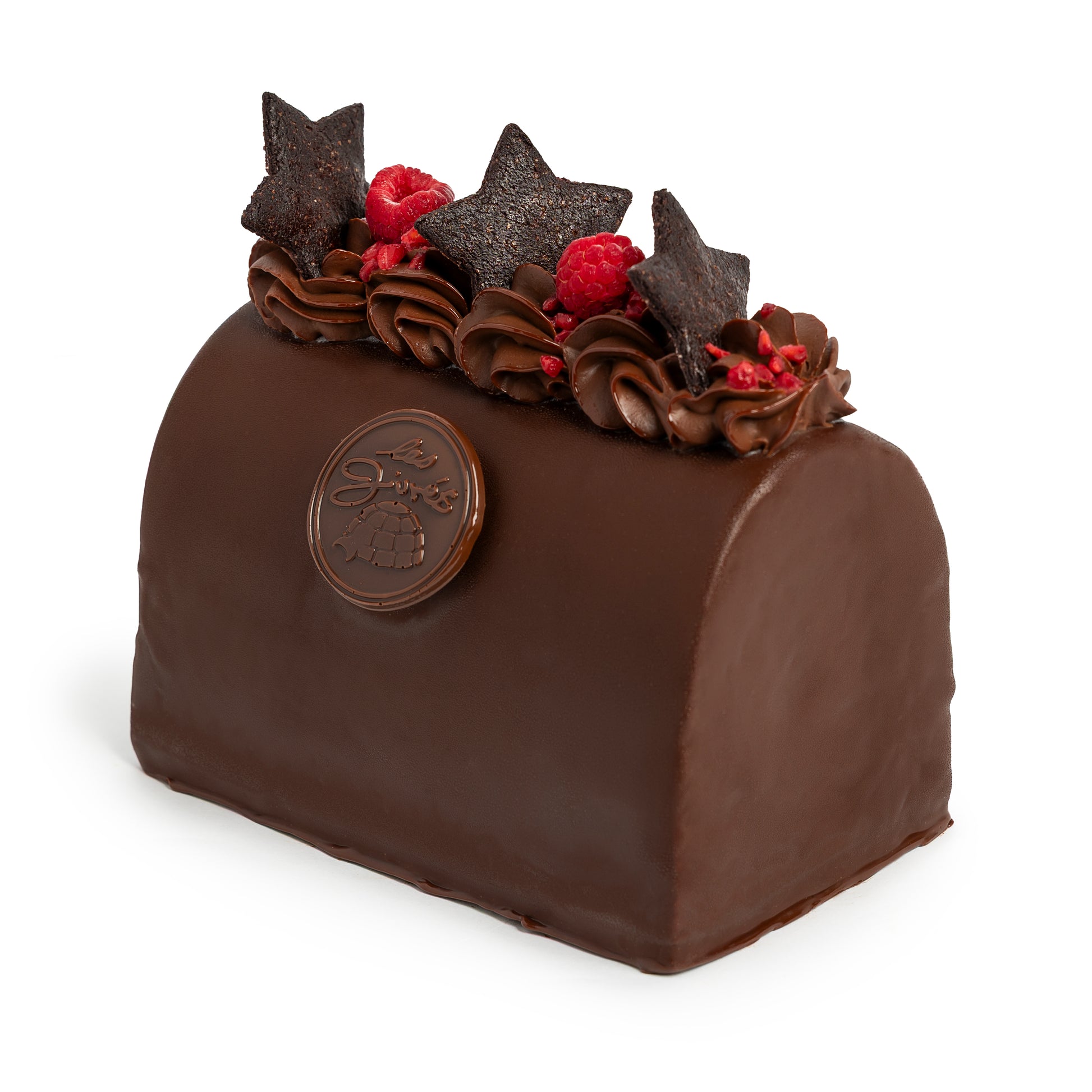 Bûche: Glaces véganes Caramel O’cacao et chocolat, sorbet framboise, génoise sans gluten et gelée de framboise, ganache chocolat. 8-10 portions